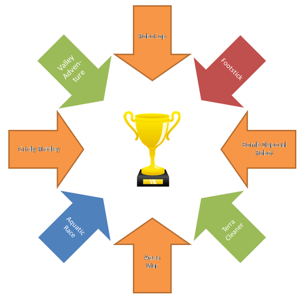 Note: Each Game will be moderated & reviewed by a judge. Points will be awarded in each game using respective Points chart. Rule Book & Points chart for each competition will be provided earlier during Boot Camp.
